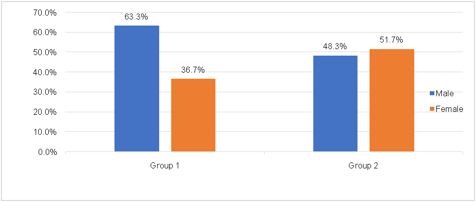 | Female | 22 (36.67%) | 31 (51.67%) |