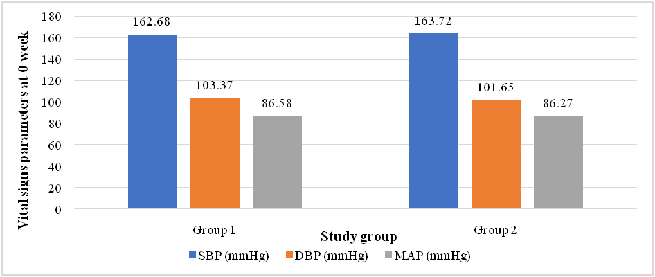 Fig. 2: Comparative bar chart of the mean of vital signs parameters at 0 w between group 1 and group 2