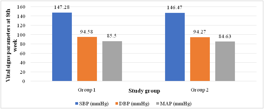 Fig. 4: Comparative bar chart of the mean of vital signs parameters at the 8th week between group 1 and group 2