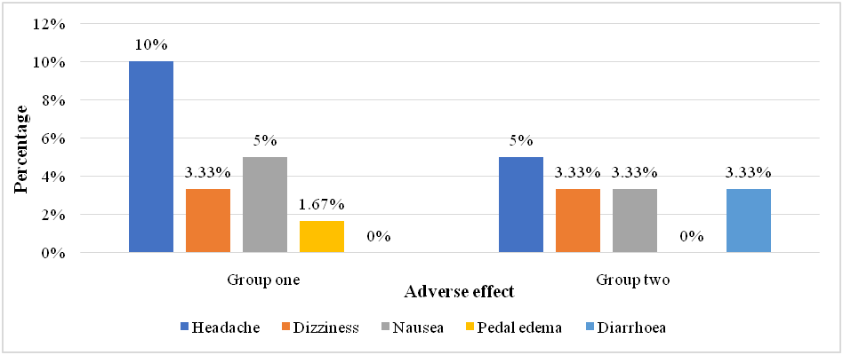 Dizziness was seen in 2 patients of group 1 and 2 patients of group2. Diarrhea was complained by 2 patients in group 2 and none in group 1. One patient from group 1 and none from group 2 complained of pedal edema. Nausea was seen in 3 patients in group1 and 2 patients in group 2.
