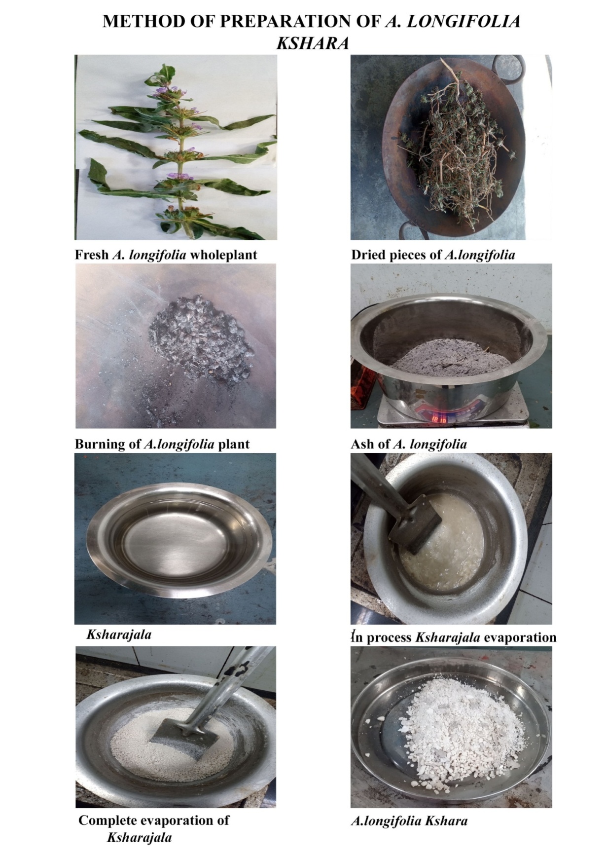 Conclusion: Many references in the classics are mentioned regarding the preparation of kshara; however, as per the findings of the present study, it might be concluded that this method is the standard method to get the maximum yield of A. longifolia kshara.