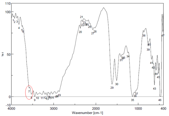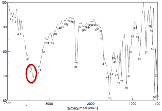 Result from the initial characterization by using FTIR of sodium sulfacetamide showed the hydrate spectra at the wave-number 3382–3455 cm-1 (fig. 3). The area shows the typical peak in the OH stretch of water [15]. The spectrum in sodium sulfacetamide monohydrate looked like two peaks coincide. On the other side, neomycin sulphate is a hygroscopic compound, so it tends to attract and hold water molecules from the surrounding environment. Even in the absence of light, it was gradually will be degraded on exposure to a humid atmosphere; moreover, the decomposition being faster at higher temperatures. Thus, in fig. 4 the hydrate is shown at the area 3100–3600 cm-1, in a very small curve (red circle signed).