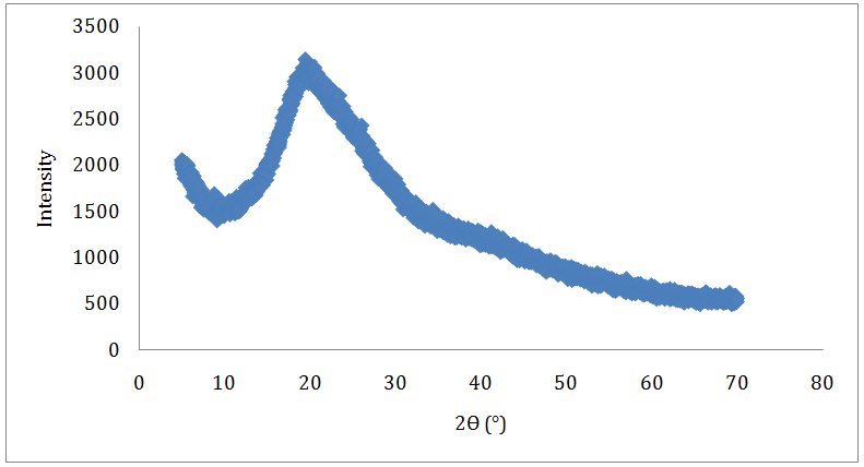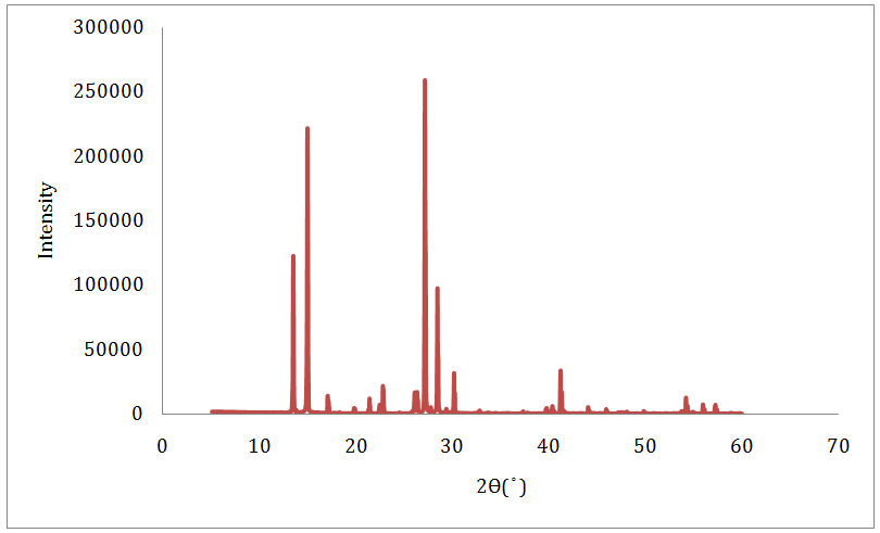 Sodium sulfacetamide diffractogram had the high intensities at 2Ө: 13, 15, 27, 29, 30, 42 °, which showed that this compound is a crystalline (fig. 7). Conversely, diffractogram of neomycin sulphate in fig. 8 below showed an amorphous pattern.