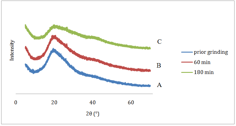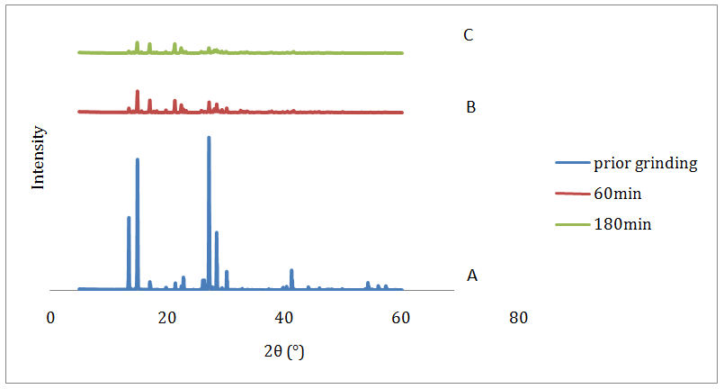 Fig.13: PXRD Diffractogram of neomycin sulphate:prior grinding (A), after grinding for 60min (B), and after Grinding for 180min(C)