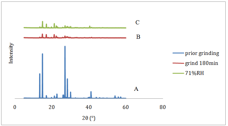 Fig.17: PXRD Diffractogram of Sodium Sulfacetamide: prior Grinding (A), after Grinding for 180 min (B); Ground Sample for 180 min after stored at 71%RH for 72h (C)