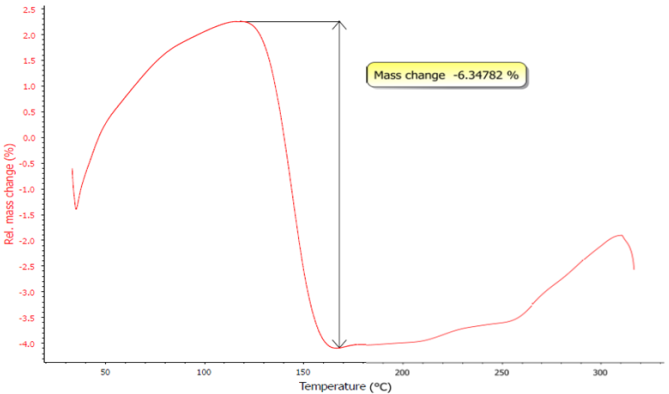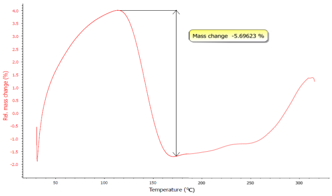 TGA thermogram in fig. 19 shows that the ground sodium sulfacetamide stored in 71% RH after 72 h increased its mass to 5.70 %. The number of mol of water in sodium sulfacetamide became 0.8 mol. Meanwhile, the storage in 99% RH after 72 h (fig. 20), caused the mass change into 6.35% or reached about 1 mol of water. The water did not totally been restored back to the original form (2 mol water). However, it was still increasing until the last of sampling time, described that the restoring back to its original hydrate form needs more time.