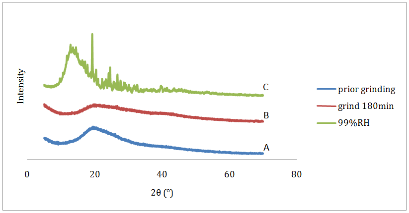 Samples after grinding for 180 min were stored in two desiccators, each containing a saturated NaCl solution at 71% RH and a saturated KCl solution at 99% RH. Sampling was done on storage at 0, 8, 24, 48, and 72 h.