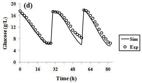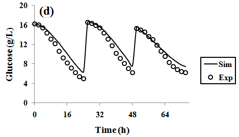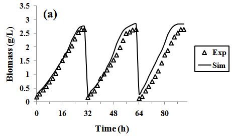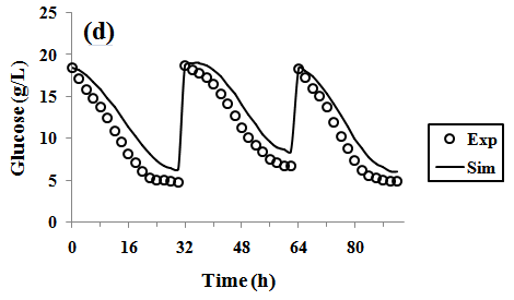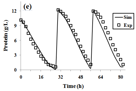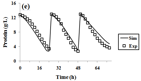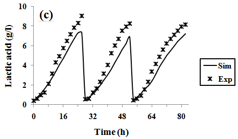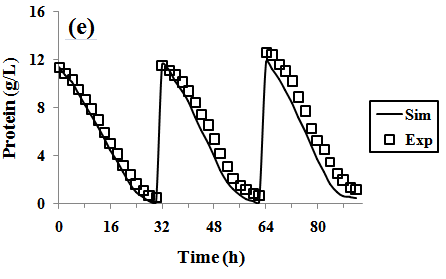 The experimental and simulated time histories of biomass, pediocin, lactic acid, glucose and protein concentration are shown in fig. 2 (a-e), 3 (a-e) and 4 (a-e) in the bioreactor with γ (Vo/V) of 0.1, 0.2 and 0.3 respectively. The model equations used for each cycle were shown in previous work [16]. The equations have been solved by MATLAB 7.0 with 4th order Runge-Kutta method for the simulation. The experimental results reveal that the time courses of biomass, pediocin, lactic acid, glucose and protein of each of three cycles of repeated fed batch process, as shown in fig. 2(a, b, c, d and e), 3(a, b, c, d and e) and 4 (a, b, c, d and e) have similar patterns. From the comparison of the experimental and simulated results, it is clear that the model is able to predict the behavior of the fermenter under the repeated fed batch mode of operation very well. The value of R2 was 0.95 to 0.97.