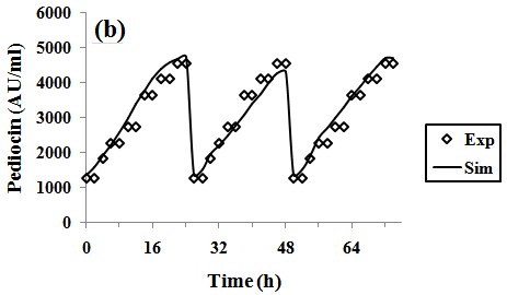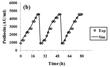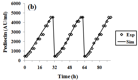 The model equations were developed for biomass, pediocin, lactic acid, glucose and protein concentration in fed batch reactor mentioned in previous studies [16]. The values of kinetic parameters were determined by experimental results also shown in previous work [17].
