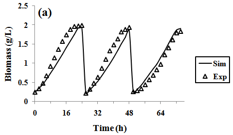 Fig. 4: Repeated fed-batch fermentation for γ =0.3. Continuous lines represented simulated values corresponding to the experimental results (points)