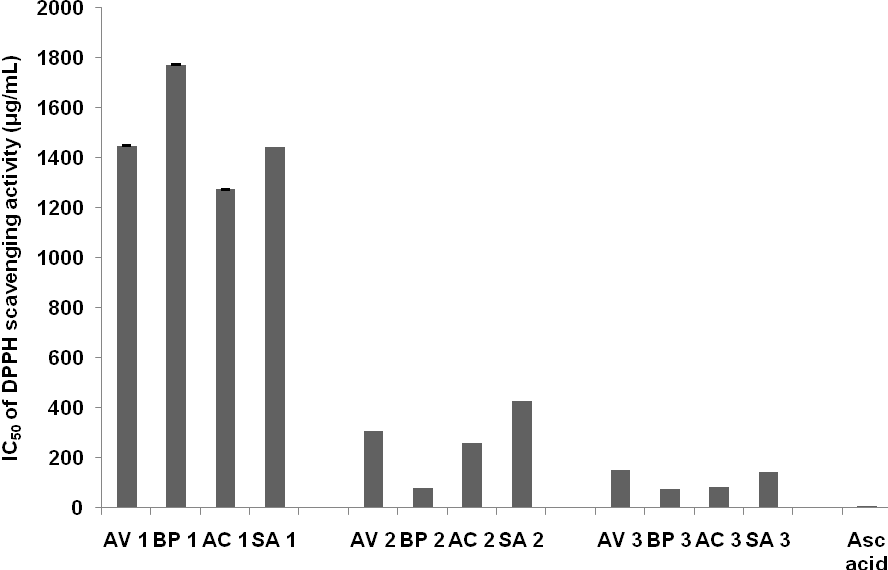 In the current study, the highest DPPH scavenging activity was given by sample BP2, followed by sample BP3 and AV3 (methanolic extract of A. vulgaris herbs), while the highest FRAP capacity was given by sample BP2, followed by sample BP3 and AC3. Methanolic extract of A. vulgaris using reflux extraction had DPPH scavenging activity 27.97%, while the previous study by Erel [16] stated that DPPH scavenging activity of methanolic extract of A. vulgaris by Soxhlet extraction was 43.38%. Study by Muchuweti [9] revealed that DPPH scavenging activities of methanolic extract of B. pilosa decreased from 80% at 0 minute to 60% at 30 minutes.