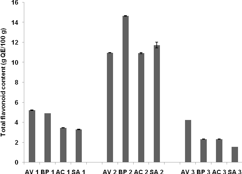 Total flavonoid content was measured using an adapted method from Chang et al [13]. The absorbance was read at wavelength 415 nm. Analysis was done in triplicate for each extract. Standard solutions of Quercetin 25-150 µg/ml were used to obtain a standard curve. The total flavonoid content was reported as percentage of total quercetin equivalents per 100 g extract (g QE/100 g).