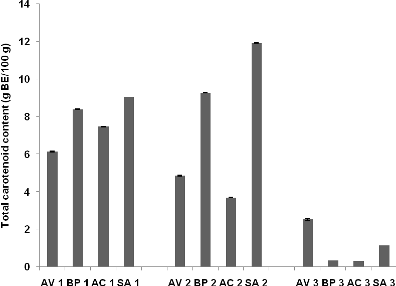 The total carotenoid content among the various extracts was expressed in term of beta carotene equivalent using the standard curve equation y = 0.012 x-0.039, R2= 0.988. The total carotenoid content in various herb extracts from four species of Asteraceae showed the different result in the range of 0.32 to 11.92 g BE/100 g (fig. 5). Ethyl acetate extract of S. arvensis herbs (SA2) had the highest carotenoid content (11.92 g BE/100 g), while methanolic extract of A. conyzoides herbs (AC3) had the lowest carotenoid content (0.32 g BE/100 g).