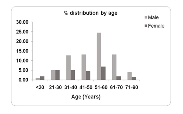 The study was carried out on 200 cases, 200 precancer cases and 200 controls. Two third (71%) of the OSCC patients were males and one-third (29%) were females with male to female ratio of 3:1. The age of patients varied from 18 to 87 y with mean age of 48.5 y (SD 15.5). Fig. 1 reveals the frequency distribution of Oral squamous cancer patients (OSCC) based on the age and gender. Maximum incidence of total cases was observed in age group from 30-70 y (approx. 80%), while less than 5% incidence was observed in age group less than 20 and more than 70 y. Moreover, the frequency distribution based on gender was same till 50 y in both males and females, while a significantly increased frequency (41%) was observed in males belonging to age group 51-70 y (χ2 =15.474, p<0.001). Overall, the incidence of OSCC was more in males than females in varying age groups.