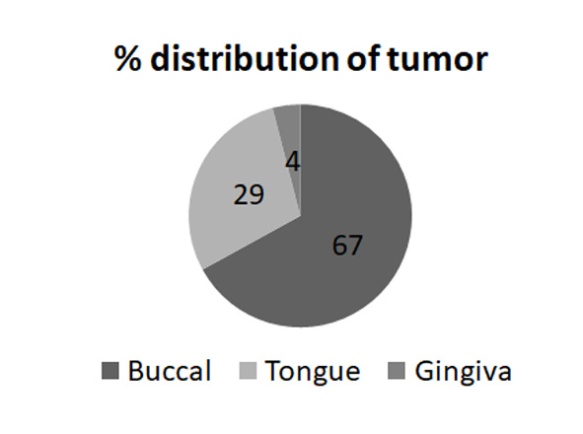 The study suggests buccal mucosa to be the most affected location (67%) in both men and women followed by tongue (29%), and gingiva was the least affected region with only 4% cases (fig. 2). Although the location of tumor was not statistically associated with gender.