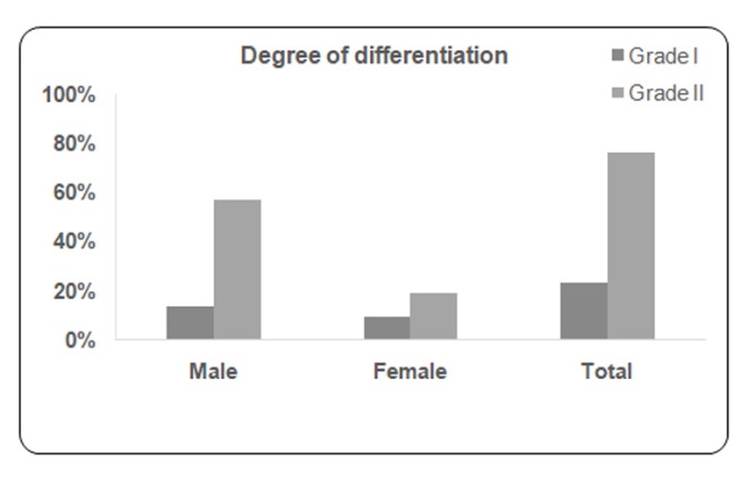 Tumors were analyzed to identify the stage (TNM) and degree of differentiation. With respect to the staging of the tumor, most of the cases were diagnosed in stage II(80%) in both genders, while 20% were in stage I (fig. 3). Approximately 76% of the total cases were moderately differentiated/poorly differentiated (grade II) and remaining 24% patients were well differentiated (grade I) (fig. 4).