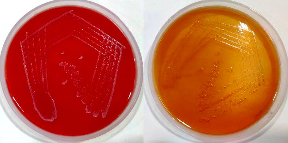Fig. 1: Colonies of Providencia rettgeri in blood agar (Left side)-non hemolytic semi-translucent colonies; Mac conkey agar (right side)-non-lactose fermenting semi-translucent colonies
