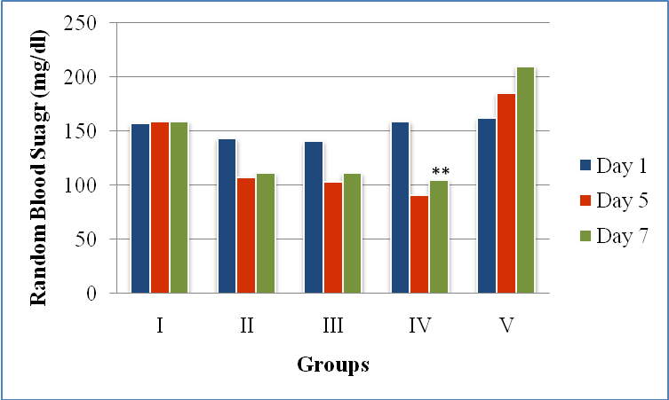 The blood sample was obtained through tail-flick method and Random Blood Sugar (RBS) levels were estimated on the1st, 5th, and the 7th day by ONETOUCH Select Simple Glucometer.
