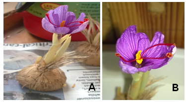 Fig. 1: Crocus sativus (Saffron) A) Corm with flower B) Flower