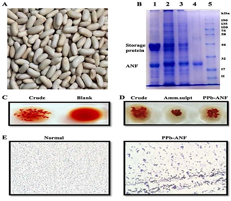 Fig. 1: Partially purified bean-ANF protein profile and lectin activity (A) Bean sample. (B) Protein bands on 12% SDS-PAGE using Coomassie brilliant blue R-250 stain lane profile: 1-crude bean extracts, 2-Ammonium sulphate precipitation (20-50%), 3-Ammonium Sulphate Precipitation (50-90%), 4-PPb-ANF, 5-Marker. (C and D) Erythroagglutinating efficacy of crude, ASP (50-90%), and PPb-ANF. (E) Leucoagglutinating efficacy of PPb-ANF compared with control untreated leucocytes