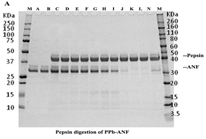 The digestive stability of PPb-ANF was determined by using pepsin (2500 units activity/mg) by following the previously described methodology [15]. Stimulated gastric fluid was prepared with 0.084 N HCl and 35 mmol NaCl and pH was adjusted to 1.2 with dilute HCl and NaOH along with 2500 pepsin activity units per mg test proteins. The pepsin digest is performed by mixing 1.9 ml of SGF containing 2500 pepsin activity units with 0.1 ml of PPb-ANF (5 mg/ml) and mixing well before placing it on 37 ᵒC. A control sample was taken without the protein and protein mixed with SGF without pepsin was also performed to evaluate auto-digestion. During the incubation time at regular intervals of 0, 5, 10, 20, 40, and 60 min, 200 µl of aliquots of the digest were taken out into a tube containing 70 µl of NaHCO3 buffer pH 11. 6 X Sample dye was added to the samples obtained, mixed well and heated for 5 min. Zero min digest is the solution of pepsin quenched before adding the test protein. All the aliquots were analyzed by SDS-PAGE 12% gel under reducing conditions. The results were observed and documented.