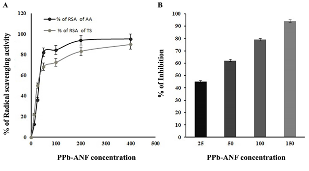 Fig. 3: Antioxidant activity of PPb-ANF: (A) represents the DPPH scavenging activity percentage of PPb-ANF, exhibiting significant radical scavenging activity upon the increasing concentration of PPb-ANF. (Test Sample-TS) and was compared with standard ascorbic acid (AA). (B) PPb-ANF exhibited good inhibitory lipid peroxidation activity with increasing concentration of PPb-ANF and it was mentioned in percentage. Results are the means of three determinations, each conducted in triplicates