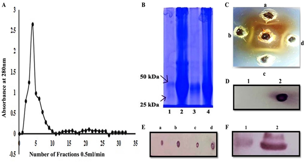 Fig. 4: Purification of anti-PPb-ANF IgG-antibody by Protein-A agarose chromatography: (A) Protein-A affinity chromatography graph for purification fractions of rabbit anti-PPb-ANF antibodies, the first peak was bound peak (IgG), eluted by changing the pH. (B) Gel protein bands (12% gel) using Coomassie brilliant blue under non-reducing condition Lane Profile:-Peak-1 Purified anti-PPb-ANF-IgG fraction, 2-Crude serum sample, 3-Dialyzed serum sample, 4-Ammonium sulfate fraction. (C) Confirmatory assay-ODD (Ouchterlony double diffusion) to analyze the immuno-precipitation of anti-PPb-ANF in different purified steps-a-crude serum, b-20-50% ASP serum, c-50-90% ASP serum, d-Dialyzed serum sample. The precipitation line in an agarose medium indicates specificity against antigen PPb-ANF. (D) Dot-immunoblot analysis for the rabbit anti-PPb-ANF polyclonal antibodies 1. Negative control-BSA and 2. PPb-ANF. (E) Immunoblot analysis of rabbit anti-PPb-ANF polyclonal antibodies. Lane 1-crude bean extract, 2-PPb-ANF