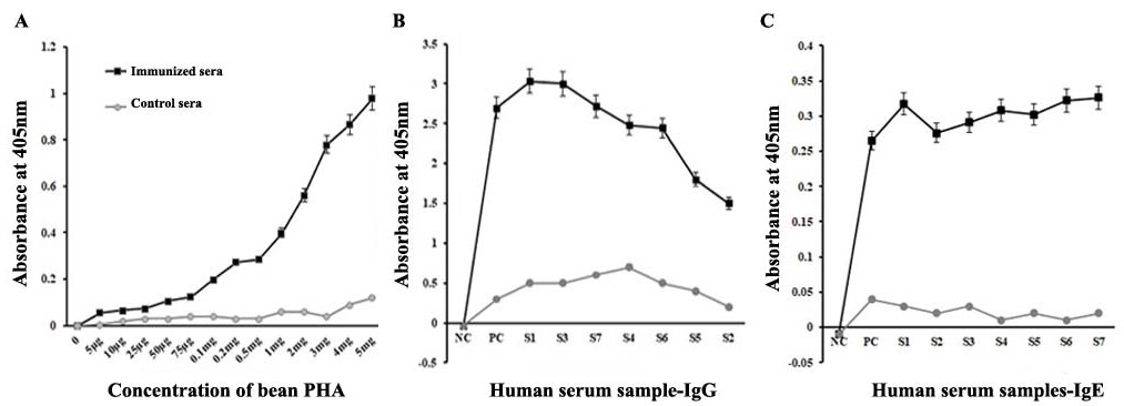 After showing successful immuno-activity towards anti-rabbit IgG antibody produced in rabbit antisera against PPb-ANF, further lectin PPb-ANF was subjected to antigen-titer, using rabbit immunized and pre-immunized sera in Indirect ELISA assays. Upon increasing the concentration of 5 µg to 5 mg of PPb-ANF, the binding ability of rabbit IgG-antibody was also increased shown (fig. 1A) and was compared with control rabbit pre-immunized sera. A final concentration of 5 mg of PPb-ANF read 0.979 OD to immunized sera, whereas for pre-immunized sera showed a reduced 0.120 OD at 405 nm. Further performed both IgG and IgE-binding ability of PPb-ANF through collected healthy individual serum samples (S1-S7). Obtained IgG, IgE-immuno-reaction. ELISA results were compared with positive control rabbit-produced anti-PPb-ANF IgG antibodies, negative control Bovine serum albumin, and plotted graph. Overall obtained results displayed that PPb-ANF is having potent immunogenic properties (fig. B and C).