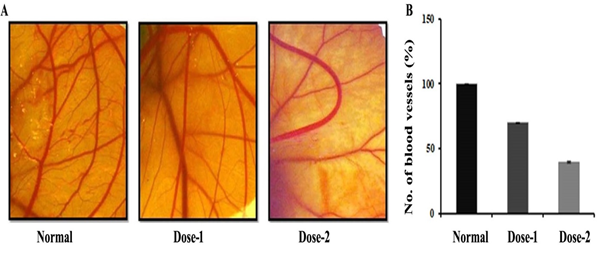 Fig. 6: Anti-angiogenic characteristic of PPb-ANF (A and B) Antiangiogenic activity of PPb-ANF was accessed In-Ova angiogenic assay models. Ova CAM images and graphical images represent the potential anti-angiogenic percentage of PPb-ANF and also observed decreased CAM vessel count density. Upon increasing the concentration of PPb-ANF (dose-1: 1.5µg, dose-2: 3µg) treated CAM models display the inhibition of vessel density in CAM