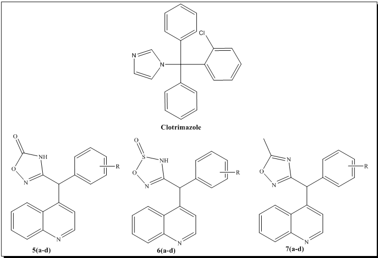 Quinoline is versatile nucleus and reported for wide range of biological activities. Quinoline derivatives have been also reported for antifungal activity [7-10]. Other heterocycles like oxadiazole [11, 12] and oxathiadiazole [13] have been also explored for antifungal activity. Based on these reports, we have coupled the quinoline nucleus with oxadiazole or oxathiadiazole rings to design novel hybrid quinoline-4-yl-oxadiazoles/oxathiadiazole derivatives. The novel compounds were designed in a way that the compounds should have similar structural configuration with that of clotrimazole (fig. 1).