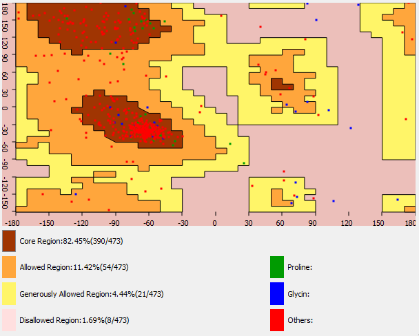 The 3D model structure of cytochrome P450 lanosterol 14α-demethylase of C. albicans was built using homology modeling. Amino acid sequence of enzyme was obtained from the Universal Protein Resource (http: //www. uniprot. org/) (Accession Code: P10613) and sequence homologous was obtained from Protein Data Bank (PDB) using Blast search. Based on the result of blast search, we used the crystal structure of human lanosterol 14α-demethylase (CYP51) with azole as a template for homology modeling (PDB ID: 3LD6). The VLifeMDS 4.3 ProModel was used for modeling of the 3D structure of protein based on the amino acid sequences of a close homologue. Alignment of amino acid sequence of CA-CYP51 (P10613) and human CYP51 (3LD6_B) is shown in fig. 2. The Blosum-62 matrix was used with a gap penalty of 1. The model was then energy minimized using the MMFF94 force field [18]. Manual inspection was made to ensure the conserved motifs and loops were correctly aligned. The quality of generated C. albicans lanosterol 14α-demethylase model was assessed by using the well-validated program likes PROCHECK [19] and its structural validation is shown in fig. 3. The further structural superimposition was performed to know the structural coordinate of target protein and RMSD value was found within standard range of 0.997607 Å. The ProModel was used to identify all the cavities present in the protein and ranks them based on their size.