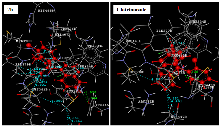 The synthesized compounds and standard drug (clotrimazole) were docked into the active site of cytochrome P450 lanosterol 14a-demethylase of C. albicans using VLifeMDS 4.3 software package to understand the binding interactions. The data obtained from docking study is presented in table 3. The docking results indicated that compounds held in the active pocket by forming the hydrophobic interactions with amino acid residues LYS156, TRP239, LEU310, ALA311, ILE377, MET378, ILE379, MET380, MET381, PHE442, GLY443, HIS447, CYS449, ILE450, and MET487. The compounds had shown hydrogen bonding interaction with amino acid residues TYR131, TYR145, MET378, ILE379, ARG382, PHE442, GLY443, ALA444, and CYS449. The compounds had shown good binding energy i. e. -78.37 to -54.76 kcal/mol. The binding interactions of compounds 5a, 6a and 7b (most active compounds from each series) and standard clotrimazole has been given in fig. 4. The compounds 5a (-72.43 kcal/mol), 6a (-78.37 kcal/mol) and 7b (-76.90 kcal/mol) had shown good binding energy. These compounds had fitted well into the hydrophobic pocket. On the basis of activity data and docking result, it was found that compound 5a, 6a and 7b had potential to inhibit cytochrome P450 lanosterol 14a-demethylase of C. albicans.
