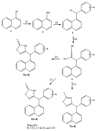 Synthesis of 5-methyl-3-(phenyl(quinolin-4-yl)methyl)-1,2,4-oxadiazoles 7(a-d)