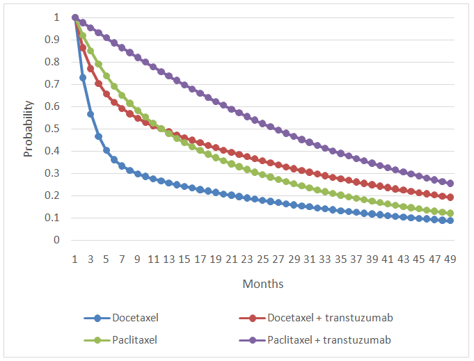 Table 2: Model probabilities for the use of trastuzumab combined with paclitaxel or docetaxel and for monotherapy with paclitaxel or docetaxel