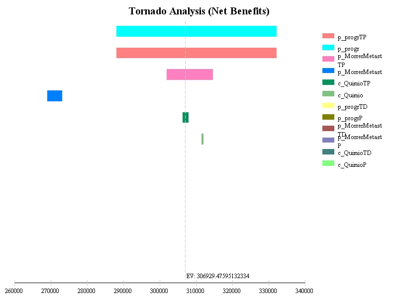 The extent of change in the results caused by systematic variation of the estimates and assumptions was tested using sensitivity analysis. The following variables of each alternative under analysis were modified: (a) cost of chemotherapy; (b) probability of cancer progression, and (c) probability of death after disease progression. The impact of these variables on the univariate analysis is shown in the tornado diagram below.