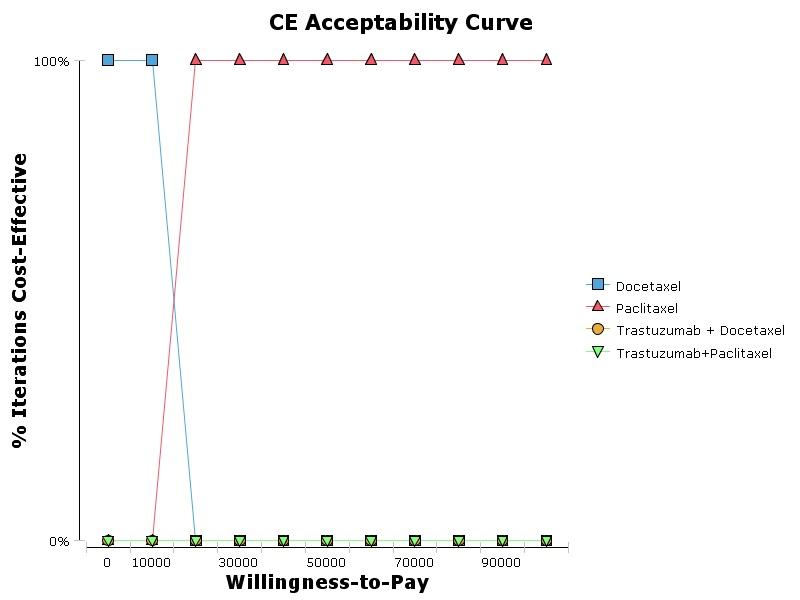 The treatment with paclitaxel was discarded because of its dominance in relation to the treatment with trastuzumab combined with docetaxel. The former proved to be more expensive and less effective. The incremental cost-effectiveness ratios (ICERs) of the remaining strategies were recalculated using cost-effectiveness analyses.