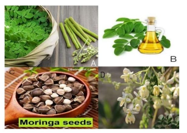 Fig. 1: Different parts of the moringa oleifera plant such as leaves, oil, seeds, flowers