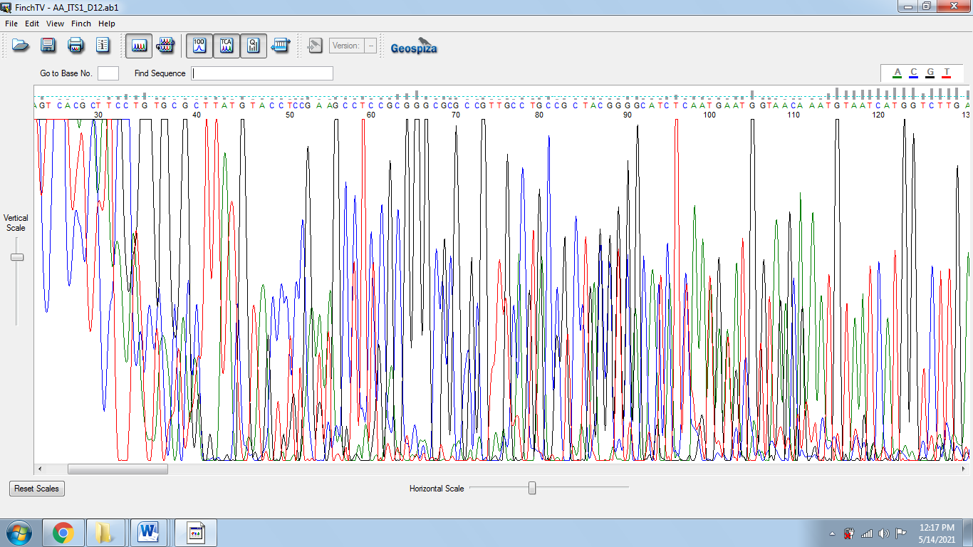 DNA was isolated by using CTAB method. After the isolation of DNA, the quantity and quality of DNA was checked with the help of Gel electrophoresis. The isolated DNA was subjected to electrophoresis and the gel will be run for getting specific region of DNA. After the process of gel electrophoresis, the gel has been removed and it was observed under UV light by comparing it with the standard IKB ladder as obtained in fig. 3. The ITS regions of DNA were amplified using polymerase chain reaction using matK and ITS2 primers for plant and ITS2, ITS4 primers for endophytic fungi respectively where it produced a proper band and the obtained products have been gel purified for obtaining a pure template for sequencing and compared it with 1KB standard ladder as obtained in fig. 4. The sequencing files are obtained in AB1 format which can be viewed by using software Finch TV as electropherogram peaks of different nucleotides in its position.