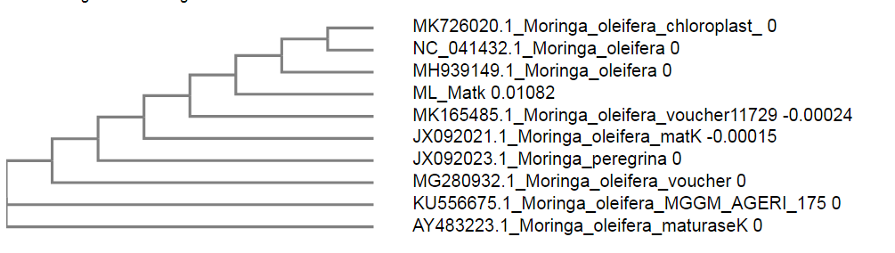 Fig. 7: Phylogenetic tree showing relationship of query sequence of Mat K from Moringa oleifera obtained using clustal omega