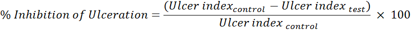Mean ulcer score for each animal will be expressed as the ulcer index. The percentage of ulcer protection was determined as follows: Ulcer index (UI) was measured by using following formula: UI = UN + US + UP Χ 10−1