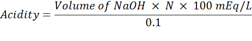 An aliquot of 1 ml gastric juice diluted with 1 ml of distilled water was taken into a 100 ml conical flask and 2-3 drops of phenolphthalein indicator was added to it and titrated with 0.01N Sodium hydroxide until a permanent pink colour was observed. The volume of 0.01N Sodium hydroxide consumed was noted. The total acidity is expressed as mEq/L by the following formula: