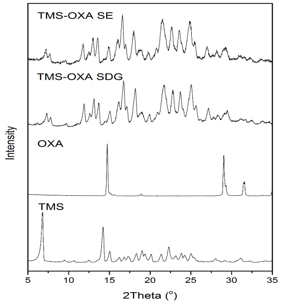 The PXRD pattern of TMS raw material used in this study is consistent with the PXRD pattern of TMS Form A that has been previously reported [19]. The diffractograms of the products after solvent-drop grinding are different from starting components. The characteristic peaks of TMS and OXA were dis appeared, whilst new peaks appear after solvent-drop grinding process.