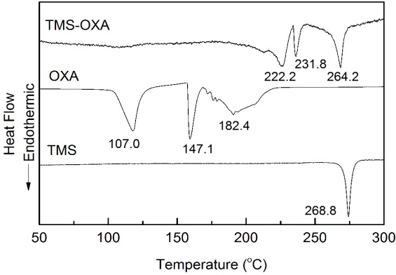 Thermograms DTA of TMS-OXA co-crystal from solvent evaporation result and each starting component are shown in fig. 3. The melting point (Tpeak) of TMS form A is 268.8°C. OXA melt and dehydrated at 107°C followed by decomposition [20]. Tpeak of TMS-OXA co-crystal is 222.2°C, whilst two endothermic peaks at 231.8 and 264.2°C are decomposition results of OXA after hydrogen bond was broken. There is no endothermic peak due to loss of water at around 80-110°C. This indicates the TMS-OXA co-crystal contains no water hydrates.