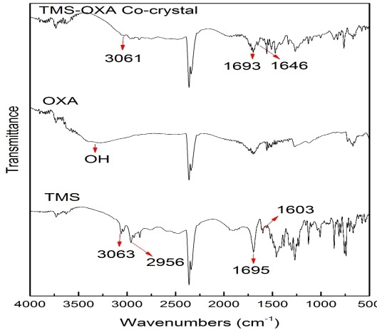 Infrared spectroscopy can be a very powerful tool in detecting co-crystal formation, especially when a carboxylic acid is used as a co-former and/or when a neutral O-H· · ·N hydrogen bond is formed between an acid and a base [6]. The IR spectra of TMS, OXA and the co-crystal are compared in fig. 4. As shown in the fig. 4, TMS has the intense peak at 1695 and 1603 cm-1 due to carbonyl (C=O) and imine (C=N) stretching, respectively. The hydrogen stretching region exhibits the aromatic C-H stretching band at 3063 cm-1 and aliphatic C-H stretching at 2956 cm-1.