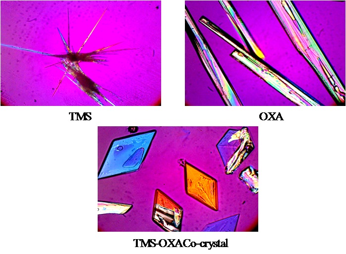 The co-crystallization process of TMS-OXA was observed under polarized microscope after the addition a drop of methanol. As shown in fig. 5, TMS-OXA co-crystal has different crystal habit from its pure components. Fig. 5 present optical microscope photos of TMS crystal with long needle shape, whilst OXA present in rod habit. The change of needle-shaped crystal of TMS and rod-shape crystal of OXA to rhomboid-shape crystal after recrystallization of its physical mixture indicates the formation TMS-OXA co-crystal.