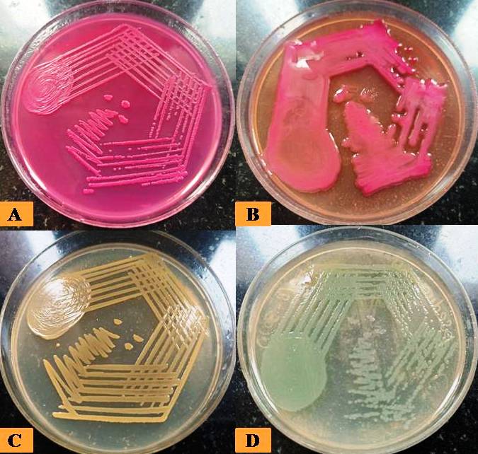 Fig. 1-1A: Flat lactose fermenting colonies of Escherichia coli; 1B: Mucoid lactose fermenting colonies of Klebsiella pneumoniae; 1C: Golden yellow pigment producing colonies of Staphylococcus aureus; 1D: Bluish-green pigment producing colonies of Pseudomonas aeruginosa