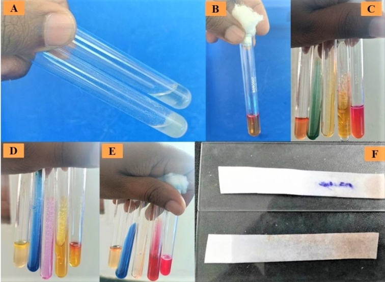 Fig. 2: Biochemical reaction of organisms, 2A-positive tube coagulase by Staphylococcus aureus; 2B-mannitol fermenting Staphylococcus aureus; 2C-Indole positive, citrate not utilized, urea not hydrolyzed, acid/acid with gas production in tsi, motile in mannitol motility medium by Escherichia coli; 2D-Indole negative, citrate utilized, urea hydrolyzed, acid/acid with gas production in tsi, non-motile in mannitol motility medium by Klebsiella pneumoniae; 2E-Indole negative, citrate utilized, urea not hydrolyzed, alkaline/no change in tsi, motile in mannitol motility medium by Pseudomonas aeruginosa; 2F-Oxidase test positive (Pseudomonas aeruginosa) and negative (Acinetobacter baumannii)