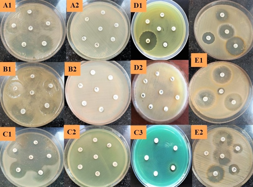 Fig. 3: Antibiotic susceptibility testing-3A1: Sensitive Escherichia coli; 3A2: resistant Escherichia coli; 3B1: Sensitive Klebsiella pneumoniae; 3B2: Resistant Klebsiella pneumoniae; 3C1: Sensitive Pseudomonas aeruginosa; 3C2: Resistant pseudomonas aeruginosa; 3C3: Imipenem resistant Pseudomonas aeruginosa; 3D1: IMIPENEM SENSITIVE Acinetobacter baumannii; 3D2: Resistant Acinetobacter baumannii; 3E1: Sensitive Staphylococcus aureus; 3E2: Methicillin-resistant Staphylococcus aureus (MRSA) Showing resistance to cefoxitin