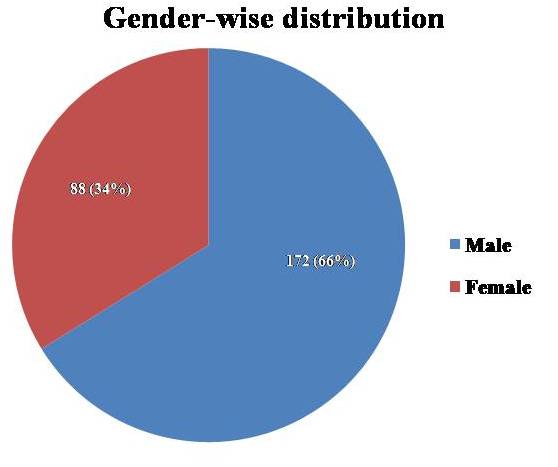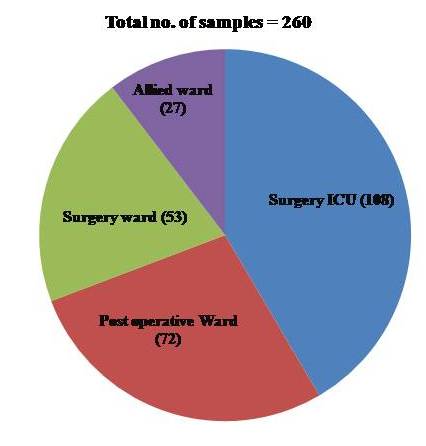A total of 260 isolates from various wound swabs and pus samples were collected from March 2022 to August 2022. All isolates were screened for drug susceptibility by the Kirby-Bauer disk diffusion method, and the results were interpreted according to CLSI guidelines 2021. In this study, the Male: Female distribution of the sample was 172:88 (males: 66%; Females: 34%) [fig. 4]. For example, age distribution shows that most of the samples were from the age group 46-60 y followed by>60 y. [fig. 5, table 1]. Ward-wise distribution show that most of the samples in the present study were received from Surgery ICU 108 (41%) followed by Postoperative ward 72 (28%), surgery ward 53 (20%), and allied wards 27 (11%) [table 2, fig. 8]. Species-wise distribution of organisms causing wound infection shows that the most common isolate collected during the present study was Escherichia coli 63 (24%) followed by Staphylococcus aureus 49 (18.8%), Klebsiella pneumoniae 38 (15.1%), Pseudomonas aeruginosa 29 (11.3%), Acinetobacter baumannii 15 (5.78%), Citrobacter freundii 12 (4.5%), Klebsiella oxytoca 08 (3.04%), Enterobacter aerogenes 08 (3.04%), Enterococcus species 07 (2.6%), Proteus mirabilis 06 (2.3%), Streptococcus pyogenes 02 (0.78%), Proteus species 01 (0.39%), Streptococcus viridans 01 (0.39%) [table 3, fig. 7]. Species-wise distribution of organisms along with antibiotic susceptibility testing shows that 15 out of 63(24%) Escherichia coli, 12 out of 38 (31.5%) Klebsiella pneumoniae, 06 out of 29 (20.6%) P. aeruginosa, 06 out of 09 (40%) Acinetobacter baumannii, 05 out of 08 (62%) Klebsiella oxytoca, 04 out of 12 (33%) Citrobacter freundii, 01 out of 07 (14.3%) Enterobacter aerogenes were multi-drug-resistant (MDR) [table 4, fig. 8].