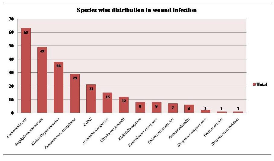 Fig. 7: Species-wise distribution of organisms causing wound infections